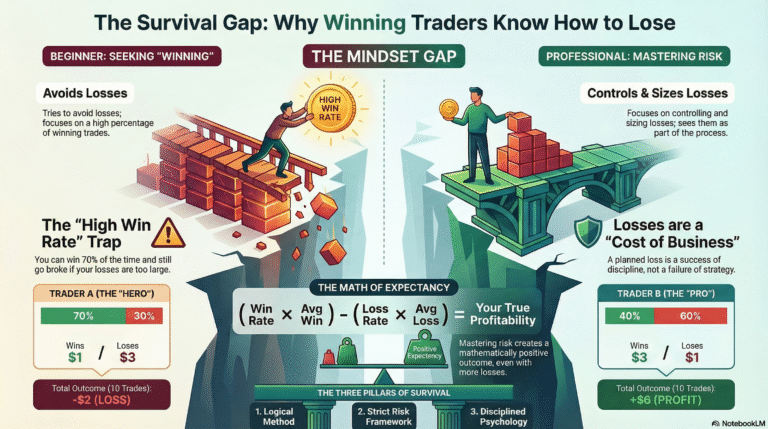 In reality, transitioning from labor-based income to risk-based equity requires an uncomfortable admission: you will lose, and you will do so with a non-negotiable statistical certainty. The market is not “rigged,” and you aren’t necessarily lacking a “magical” indicator. Most fail because they are playing the wrong game. Professional trading is not a contest of who can be “right” most often; it is a clinical exercise in knowing how to lose correctly to survive long enough for a mathematical edge to manifest.